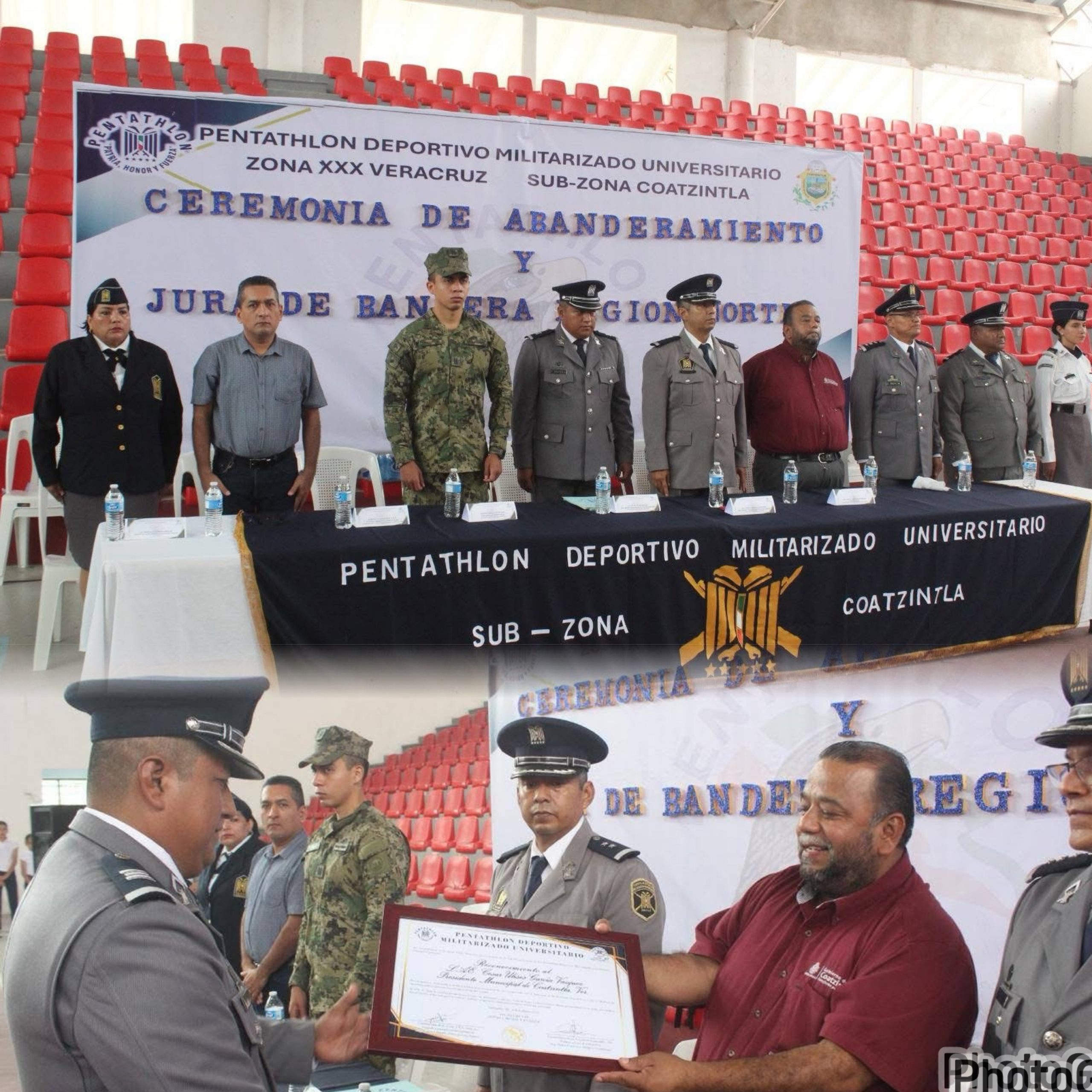 El Presidente Municipal Lic. César Ulises García Vázquez recibió el reconocimiento de importantes autoridades del Pentathlon Deportivo Militarizado Universitario durante su gran Ceremonia de Abanderamiento a la sub-zona Coatzintla de reciente creación y entrega de Bandera Guión, el Estandarte Oficial de la institución en un evento en el que además hubo la Jura del Lábaro como simbolismo de Graduación a los nuevos Cadetes de la región Norte Papantla, Poza Rica y Túxpan.