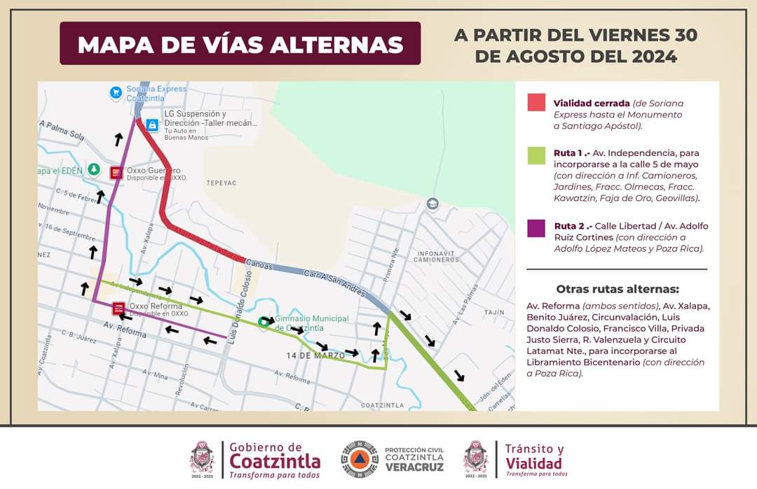 DEBIDO A QUE LA COMPAÑÍA CONSTRUCTORA DE LA CARRETERA REGIONAL POZA RICA-SAN ANDRÉS, -A LA ALTURA DE ESTE MUNICIPIO-, PROCEDERÁ A HACER EL LEVANTAMIENTO DE LA CARPETA DE LA SIGUIENTE ETAPA EN LOS TRABAJOS DE CONSTRUCCIÓN DE DICHA VÍA, SE HACE DEL CONOCIMENTO DE LA CIUDADANÍA USUARIA DE LA MISMA, QUE A PARTIR DEL DÍA DE MAÑANA 30 DE AGOSTO, PERMANECERÁ CERRADA APROXIMADAMENTE UN MES.