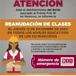 Ante el debilitamiento del evento de Norte asociado al sistema frontal del Frente Frío 14, las secretarías de Protección Civil y de Educación han determinado la reanudación de clases para este jueves 12 en todos los niveles educativos de los 212 municipios.