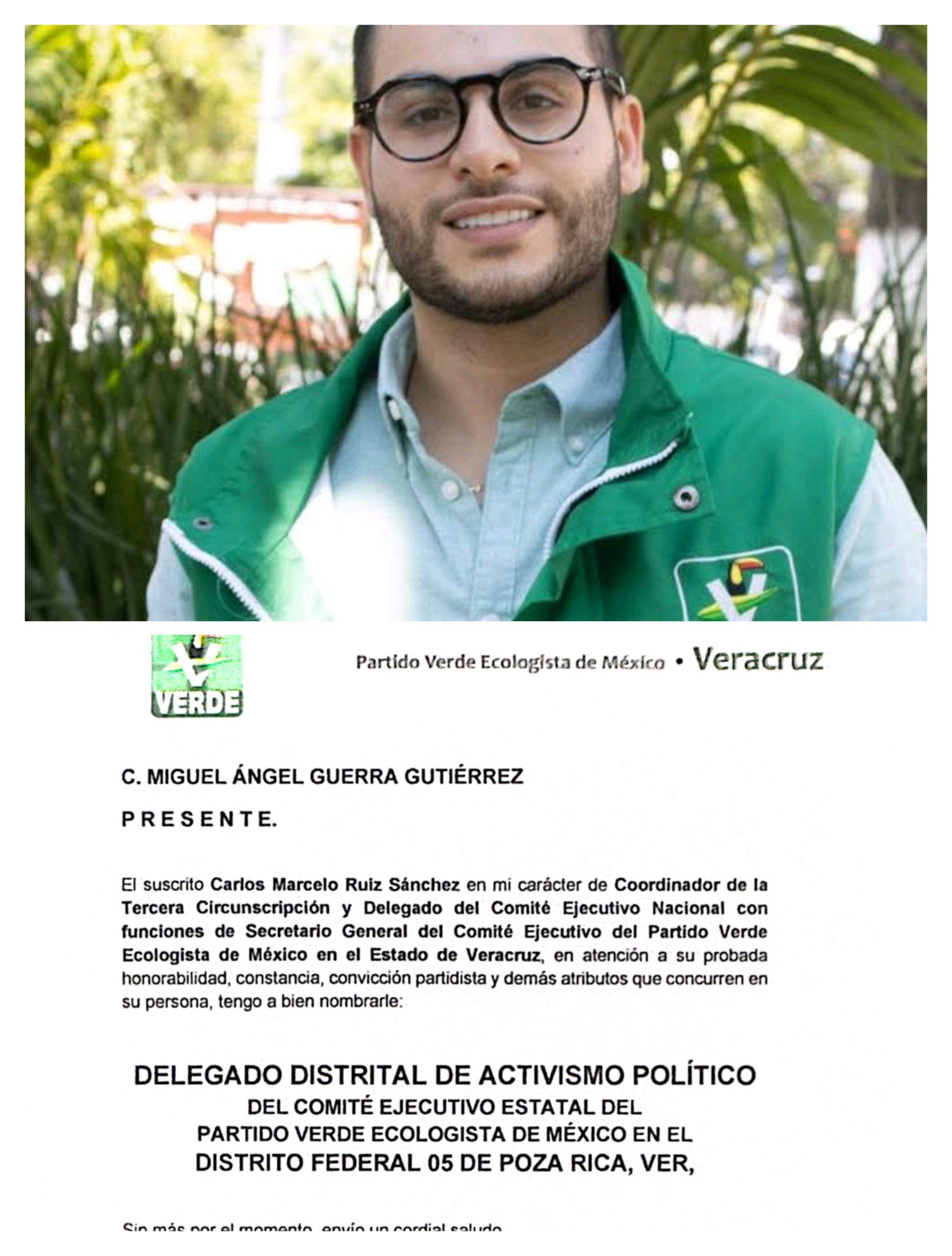 En este sentido, el delegado distrital señaló que él cuenta con dicho cargo desde el pasado 24 de junio del 2023, por lo que señaló que la información la pueden encontrar en la página oficial del Partido Verde Ecologista de México del Estado de Veracruz.