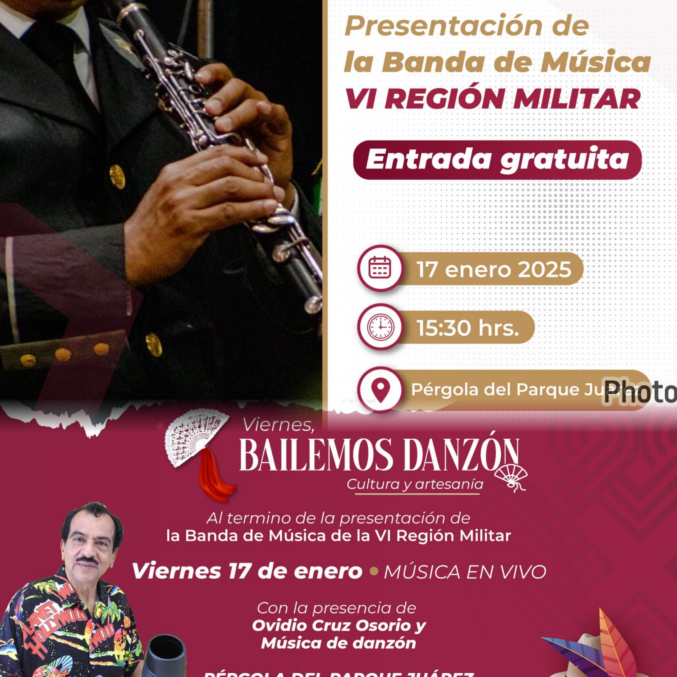 La Secretaría de la Defensa Nacional, en coordinación con el Ayuntamiento de Poza Rica, extiende una cordial invitación a toda la población para disfrutar de la presentación de la Banda de Música de la VI Región Militar, este próximo viernes 17 de enero a las 15:30 horas en la Pérgola del Parque Juárez.