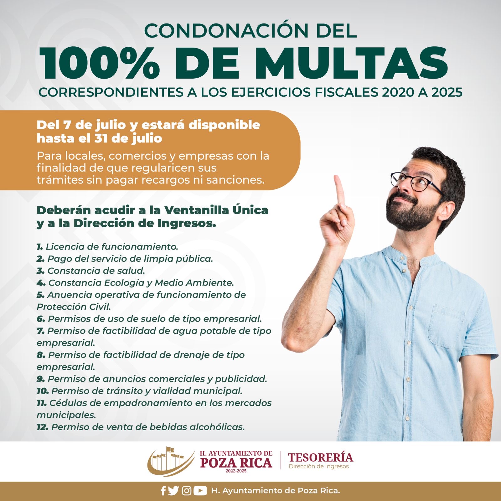 Esta medida aplica a 12 conceptos de cobro municipal: licencias de funcionamiento, pago del servicio de Limpia Pública; constancias de Salud, Ecología y Medio Ambiente; permisos de uso de suelo de