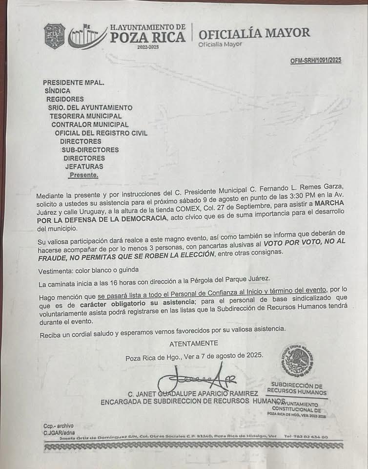 Pero la realidad es otra: esta no es una marcha ciudadana, es un montaje político financiado y operado desde Palacio Municipal. Funcionarios y empleados del Ayuntamiento han denunciado que están siendo obligados a asistir bajo amenaza de represalias laborales, advirtiéndoles que se pasará lista para confirmar su presencia.