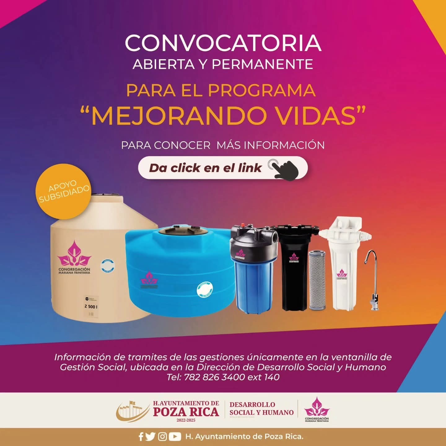 Ayuntamiento de Poza Rica, a través del Programa Municipal de Bienestar Social “Mejorando Vidas” y en coordinación con la Congregación Mariana Trinitaria, ha emitido una nueva convocatoria para la adquisición de tinacos, filtros y purificadores de agua a bajo costo.