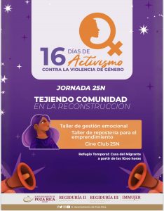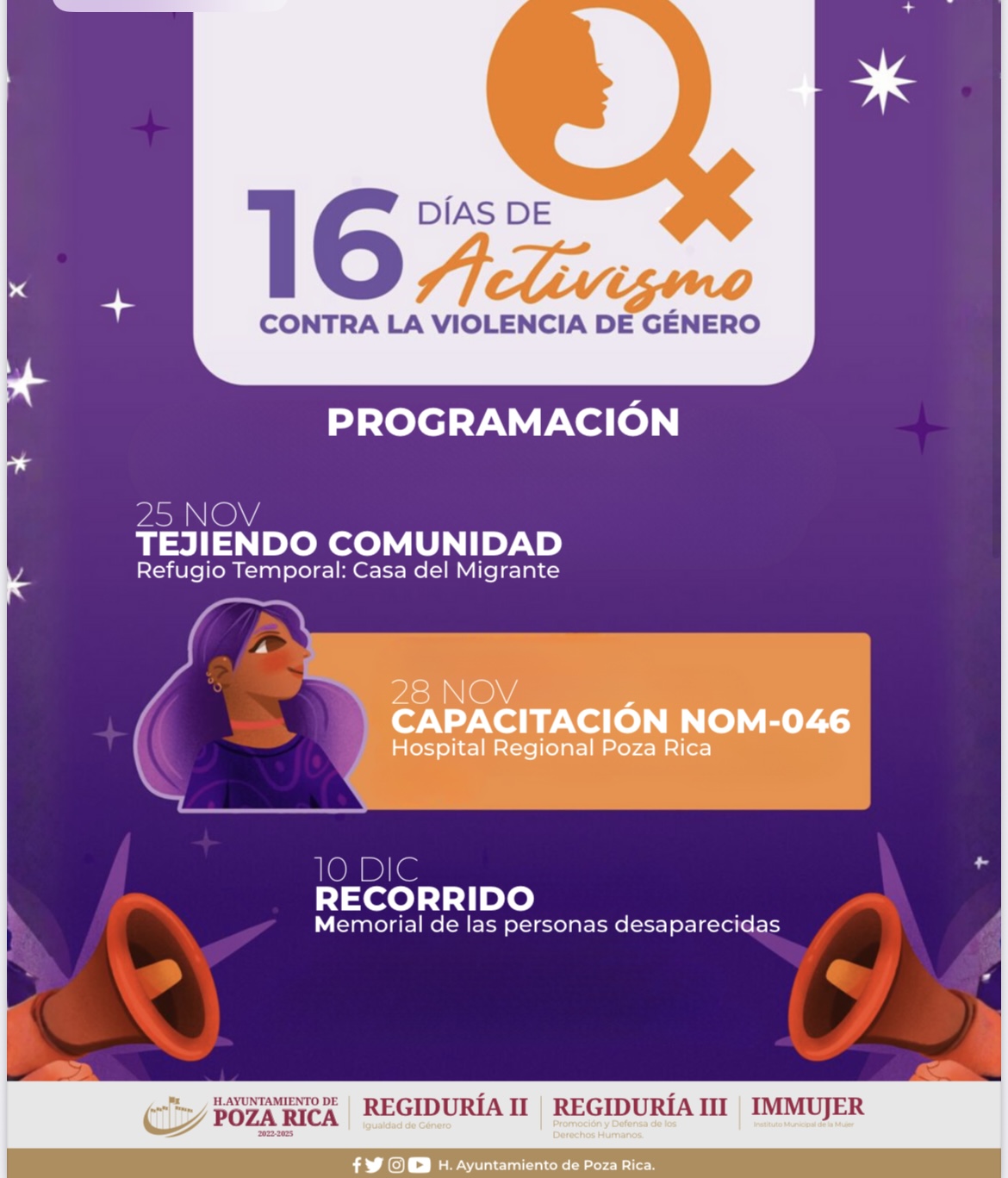 El Ayuntamiento de Poza Rica, a través del Instituto Municipal de las Mujeres (IMM), dio a conocer el calendario de actividades que se realizará del 25 de noviembre al 10 de diciembre como parte de la Jornada 25-N y los 16 Días de Activismo contra la Violencia de Género, con acciones enfocadas en atención, capacitación y sensibilización a distintos sectores de la población.