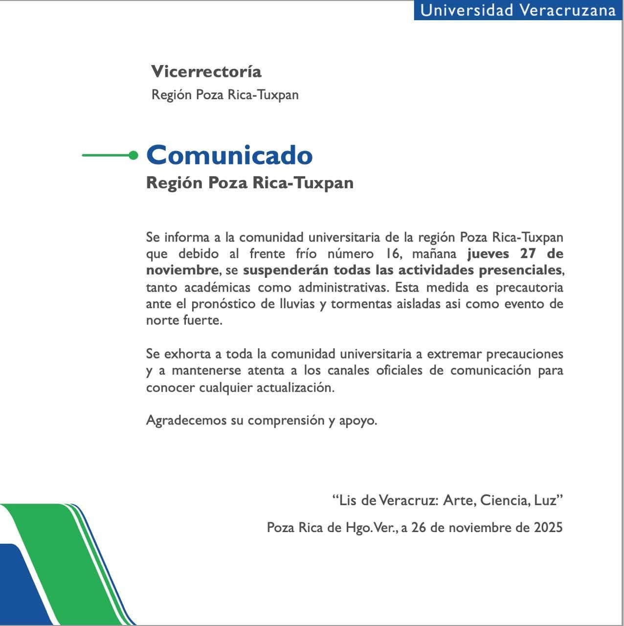 UV Suspende clases para mañana Jueves en PozaRica y Tuxpan por el Frente FRIO #16