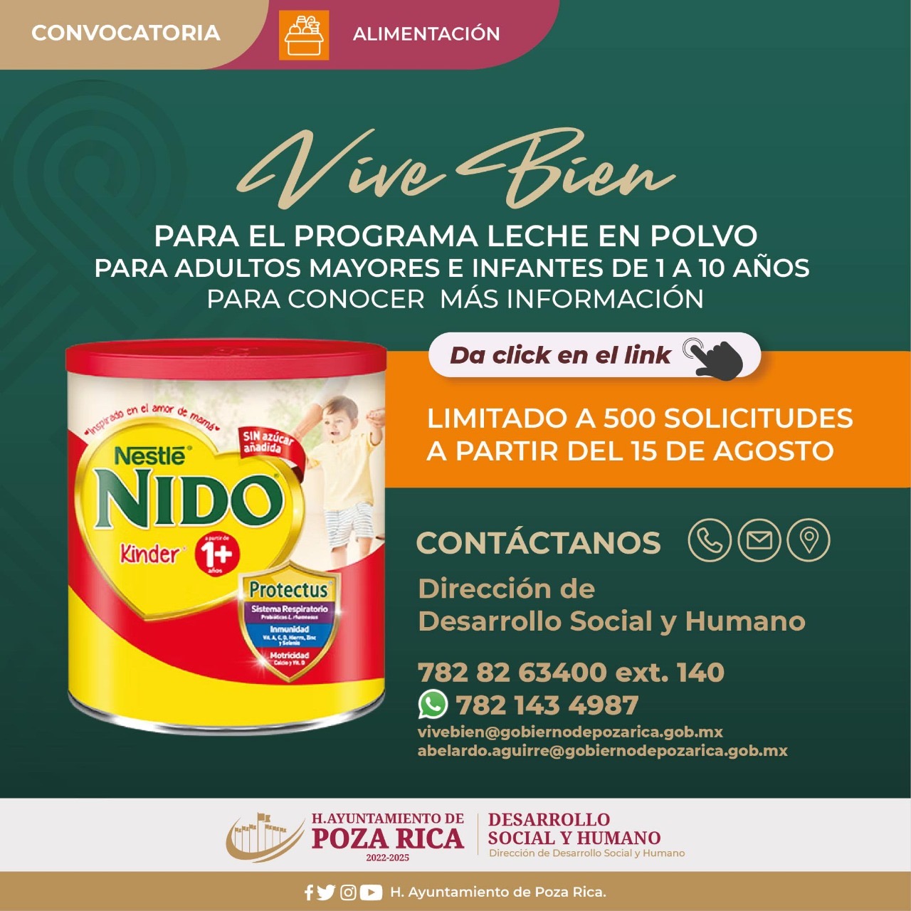 El Ayuntamiento de Poza Rica, presidido por Fernando Remes Garza, a través del Programa Municipal de Bienestar Social “Vive Bien”, abre este viernes 15 de agosto hasta agotar