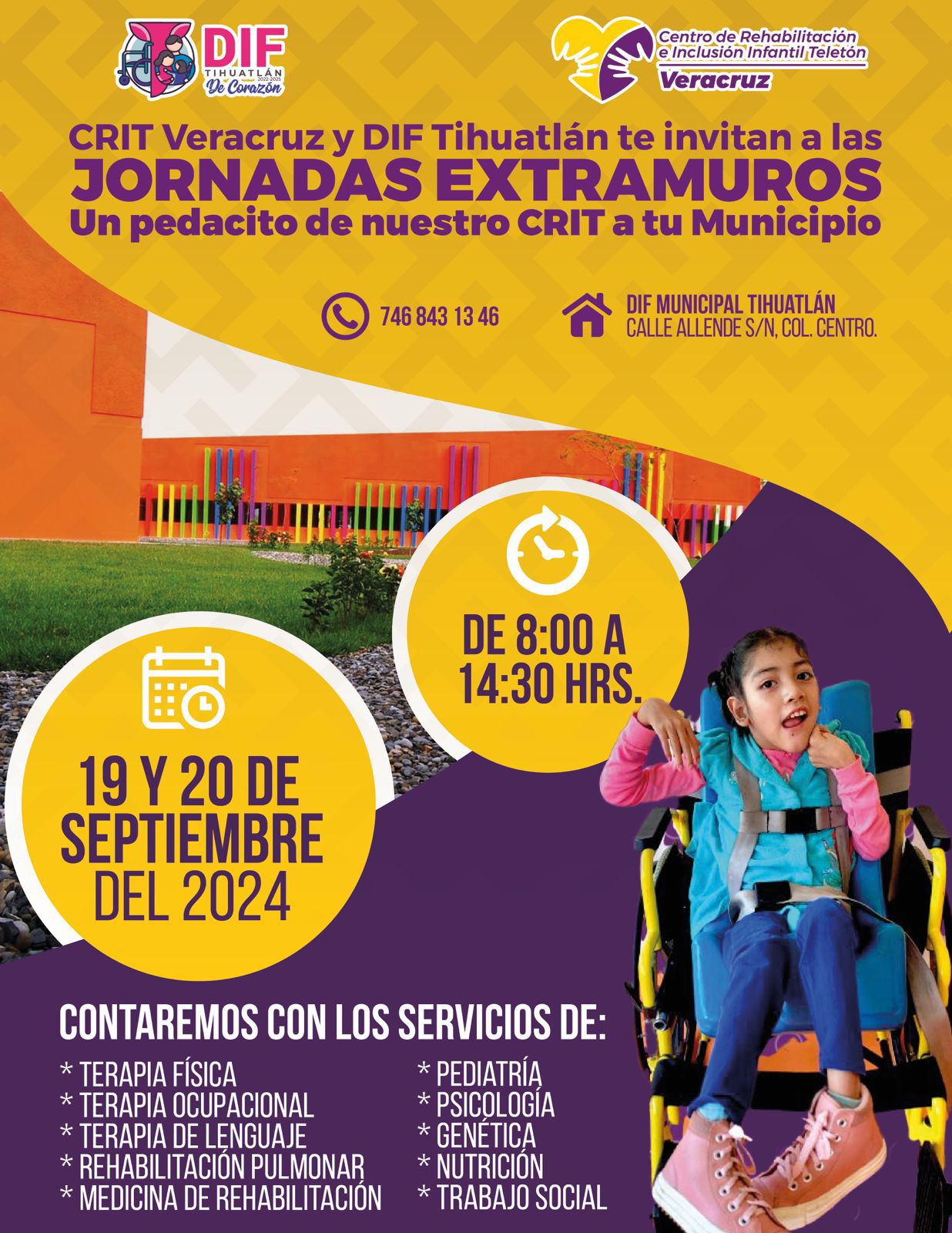 Como parte de las acciones en favor de las familias en situación de vulnerabilidad, los días 19 y 20 de septiembre, el DIF municipal en coordinación con el Centro de Rehabilitación Infantil Teletón (CRIT), Poza Rica, podrán en marcha las “Jornadas Extramuros”, en los se atenderá con diversos servicios a los habitantes de este municipio.