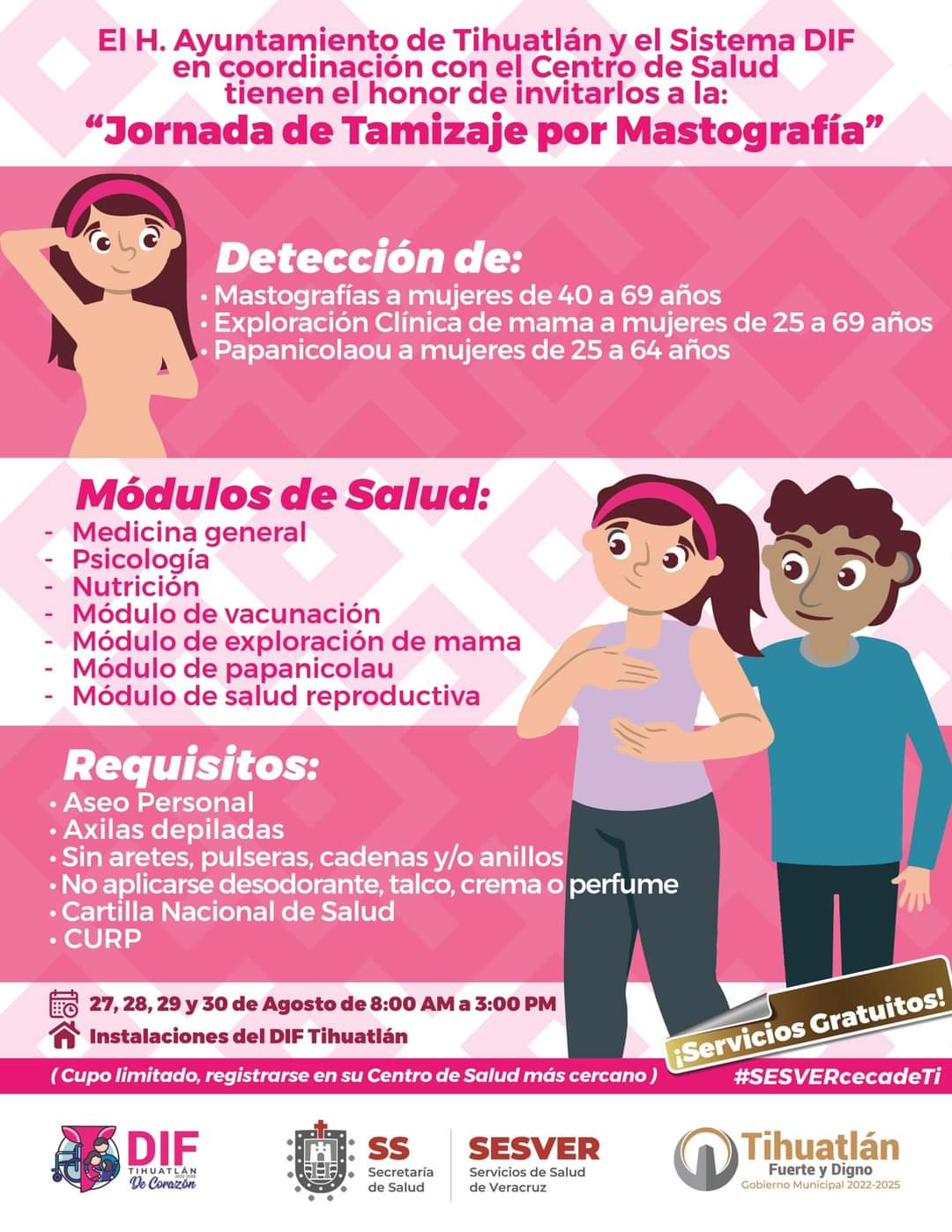 Como parte de las acciones para la prevención de cáncer en la mujer, el DIF municipal informó que, a partir del 27, 28, 29 y 30 de agosto de 2024, pondrá en marcha la “Jornada de Tamizaje por mastografía”, acciones coordinadas bajo los Servicios de Salud de Veracruz (SESVER) a través de la Jurisdicción Sanitaria y el Centro de Salud Tihuatlán, en favor de las familias tihuatecas.