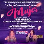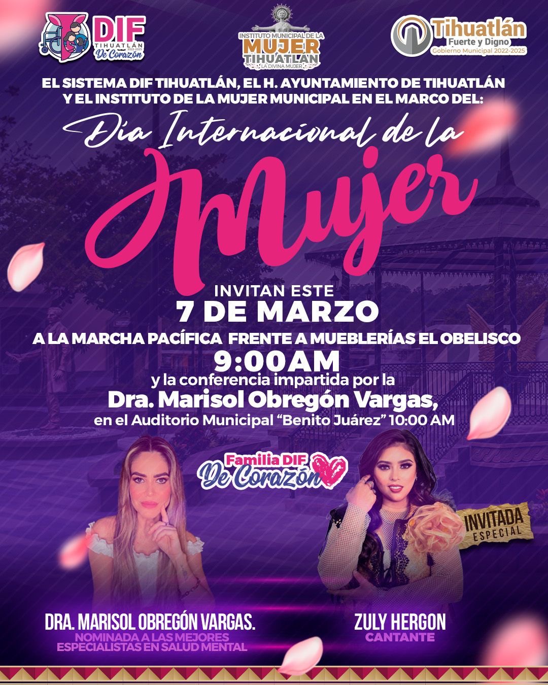 El DIF, la regiduría y dirección, comisionadas en Instancia de la Mujer, invitan para que este 7 de marzo nos acompañen a una marcha pacífica, la cual dará inicio frente a la mueblería el Obelisco y a las 10:00 horas, la conferencia impartida por la doctora, Marisol Obregón Vargas, psicóloga integral y la cantante, Zuly Hergón, en el auditorio municipal Benito Juárez”, concluyó.